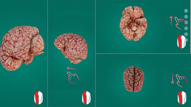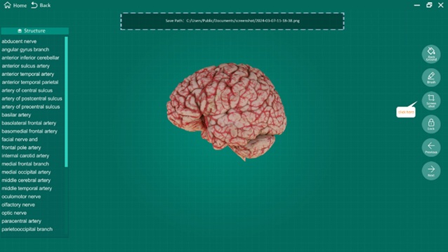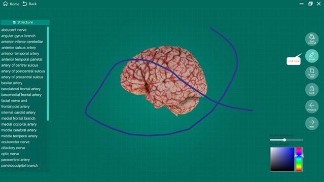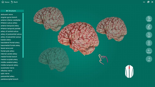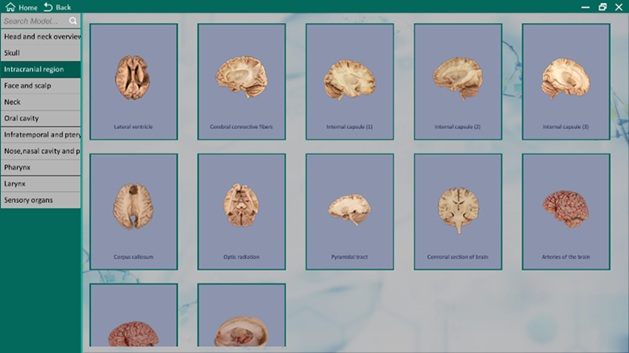 The following demonstration will give you a quick apprentice of how it can help in learning anatomy. For an example, to study the anatomy of the HEAD AND NECK, click the “Intracranial region”, 12 brain specimens will be shown on the screen.
