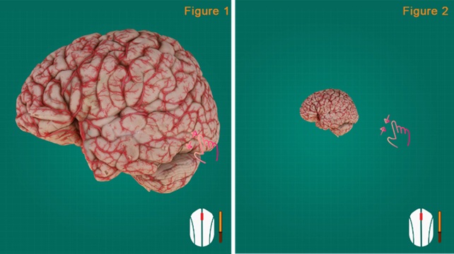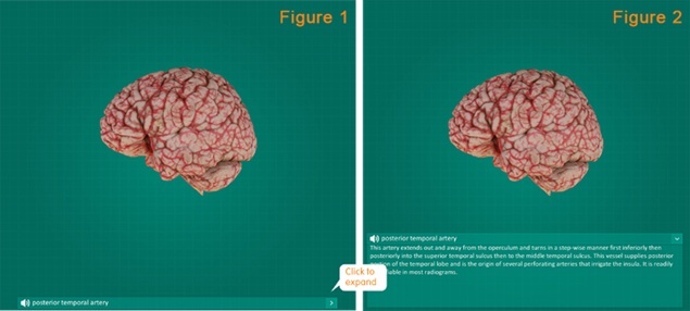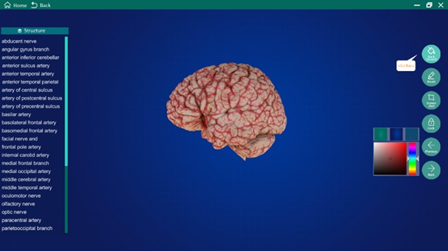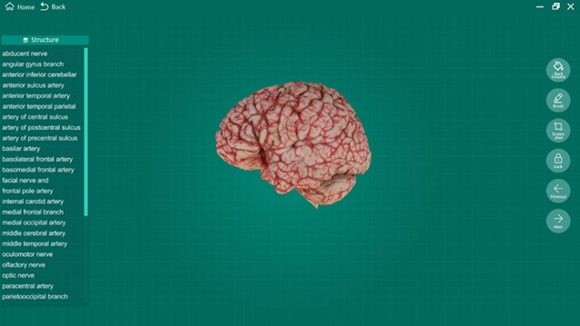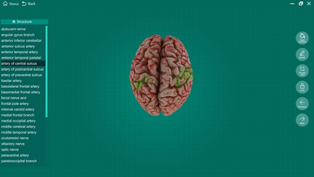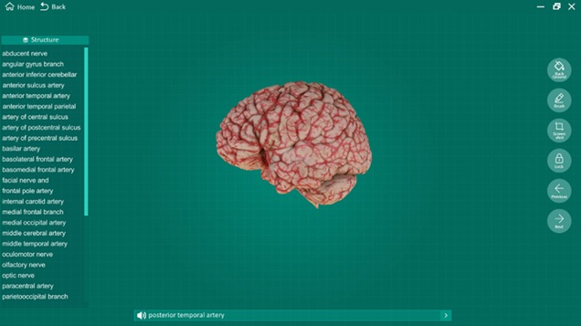 Click to select “Arteries of the brain”. The image of the specimen appears on the center of the screen with structure terms shown on the left.