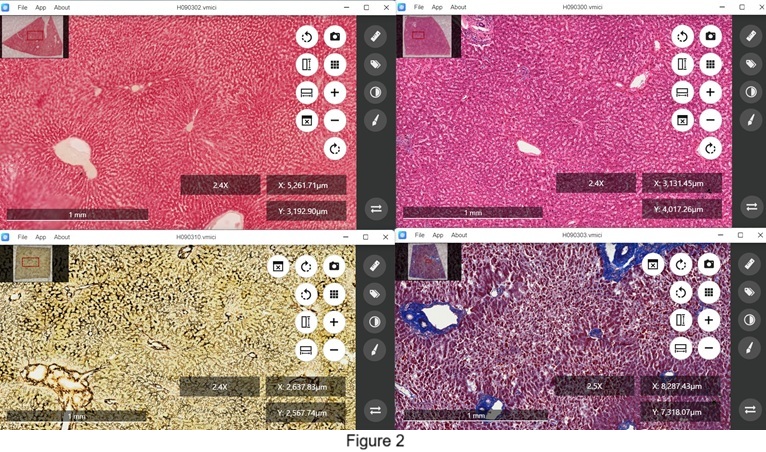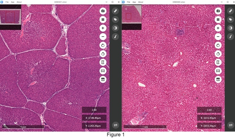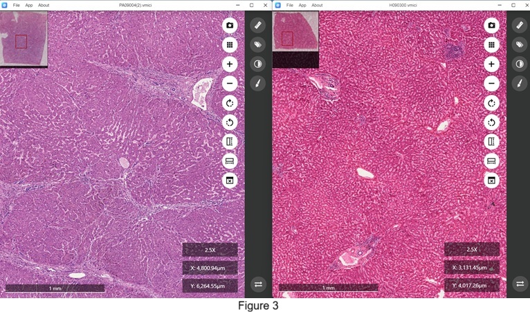 Moreover, this tool is invaluable for distinguishing between normal and diseased tissues, as shown in Figure 3. The right window displays a tissue section from a normal human liver, while the left window presents a section from a human liver affected by cirrhosis, with both sections stained using hematoxylin-eosin.