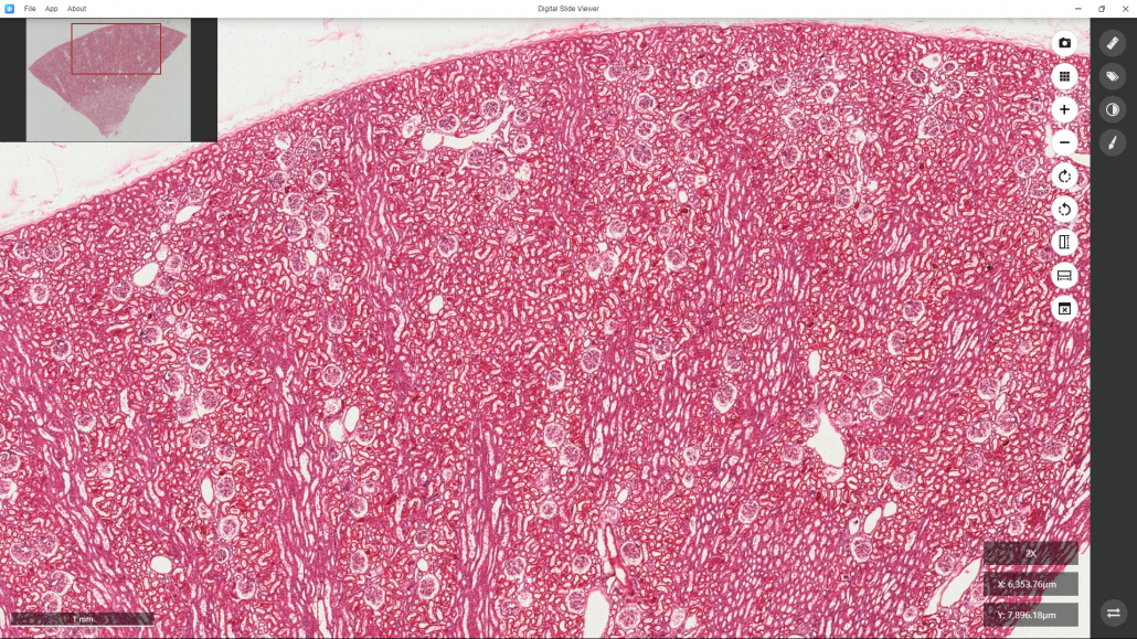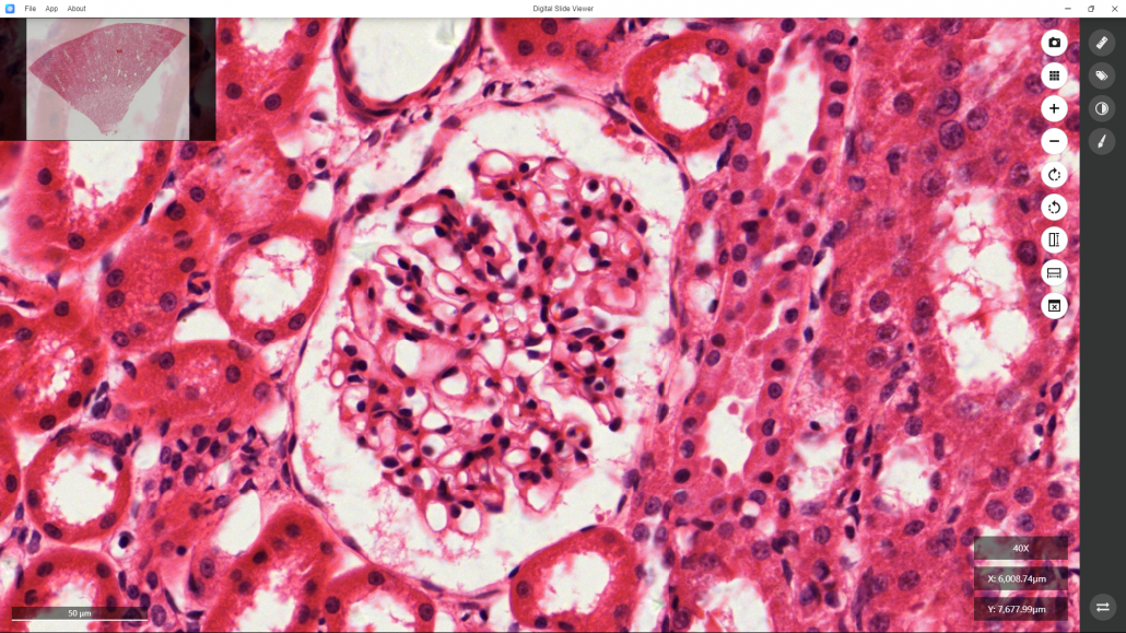 Here, for example, you want to observe the detailed structure of a glomerulus in this section. You may lock on the target and continue to enlarge the image in the same way as described above.