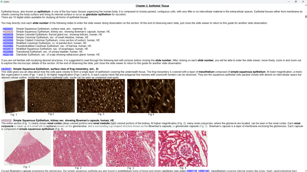 The view will be returned to the “Chapter 2 Epithelial Tissue” of “DSMH Guide”. Color change of “H020020” indicates that this slide has just been observed.