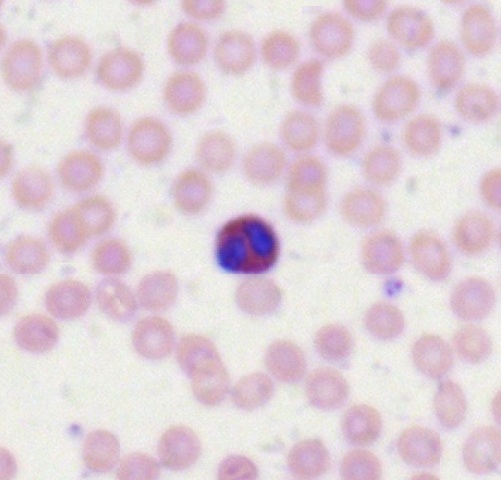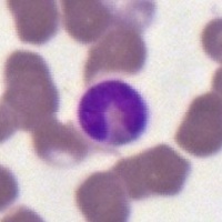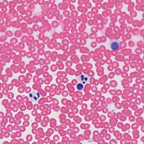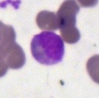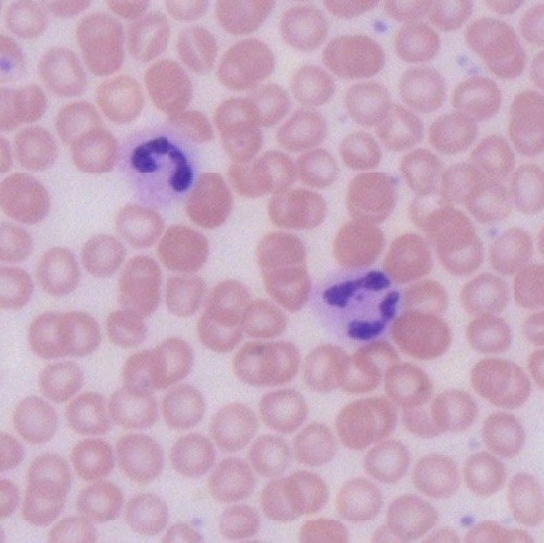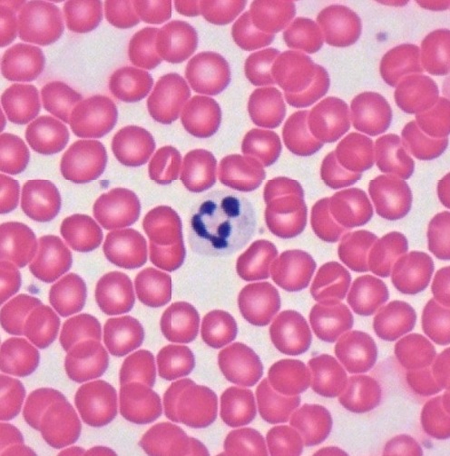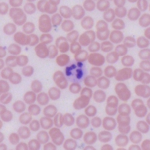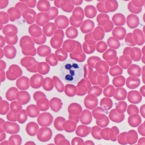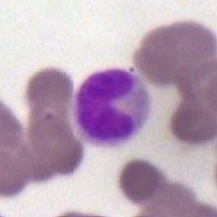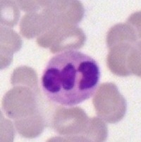 Neutrophils are the most common type of leukocytes in blood and constitute 40-75% of circulating leukocytes depending on if they are in the acute inflammatory response to tissue injury. The most prominent feature of the neutrophil is the highly lobulated nucleus. As seen in smear preparation stained by Wright stain (Figs. 5-7 ~ 5-10), hematoxylin-eosin stain (Figs. 5-11 ~ 5-14), and Giemsa stain (Figs. 5-15 ~ 5-18), nucleus of a mature neutrophil usually has five lobes connected by fine strands of nuclear material (Figs. 5-7, 5-11, and 5-15). In less mature neutrophils have less than five lobes of nuclei (Figs. 5-8, 5-9, 5-12, 5-13, 5-16, 5-17) or even not as lobulated (Figs. 5-10, 5-14, and 5-18). Except the lobulated nucleus, the cytoplasm of neutrophils is highly stippled with purplish granules which are more visible in blood smear stained by Wright stain (Figs. 5-7 ~ 5-10).