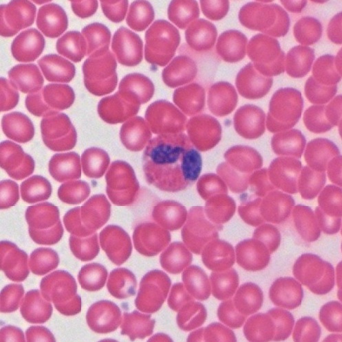 Basophils are the least common leukocyte and constitute less than 1% of leukocytes in circulating blood. They have large intensively basophilic granules in cytoplasm. As seen in smear preparation stained by Wright stain (Fig. 5-26), hematoxylin-eosin stain (Fig. 5-27), and Giemsa stain (Fig. 5-28), these granules usually obscure appearance of the nucleus. Basophil has a diameter of 14-16 μm, intermediate size between neutrophil and eosinophil. It is the precursor of the mast cell (Fig. 5-29). Both share many structural and functional similarity.