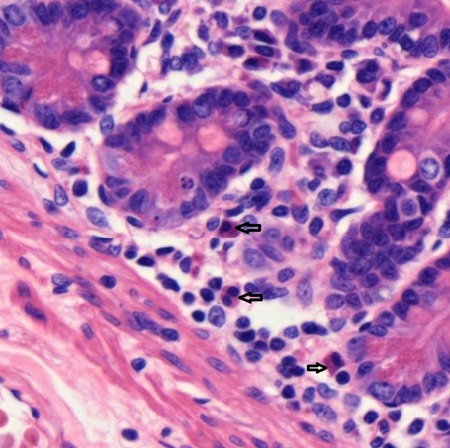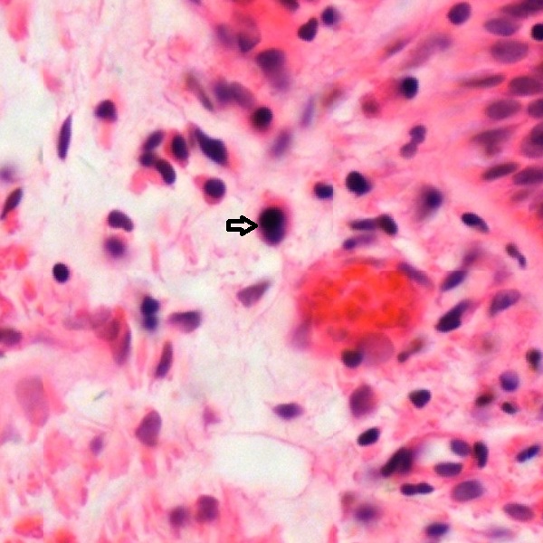 The majority of eosinophils (arrow) are only present in blood for hours then enter the skin (Fig. 5-23), mucosa of pulmonary tract (Fig. 5-24), and gastrointestinal tract (Fig. 5-25) in response to injury or bacterial invasion.