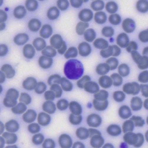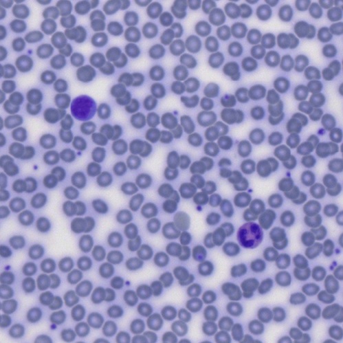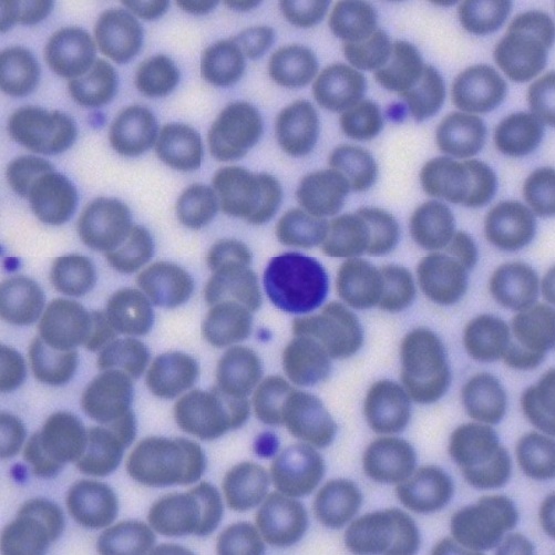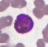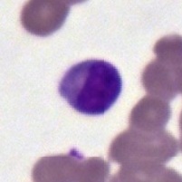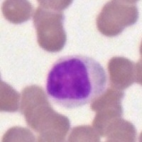 Lymphocytes are the smallest leukocytes with a variation of sizes depending on the activity. The small inactive lymphocytes are 6-9 μm in diameter, while the large active lymphocytes are 9-15 μm in diameter and make up only 3% of total lymphocytes. They have a round, densely stained nucleus with a relatively small amount of pale basophilic, non-granular cytoplasm. In smear preparations stained by Wright stain (Figs. 5-30 ~ 5-32), hematoxylin-eosin stain (Figs. 5-33 ~ 5-35), and Giemsa stain (Figs. 5-36 ~ 5-38), various lymphocytes can be observed.