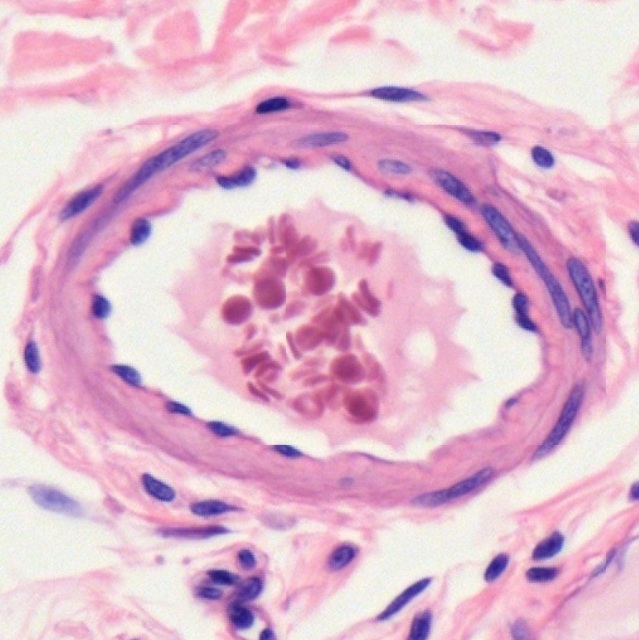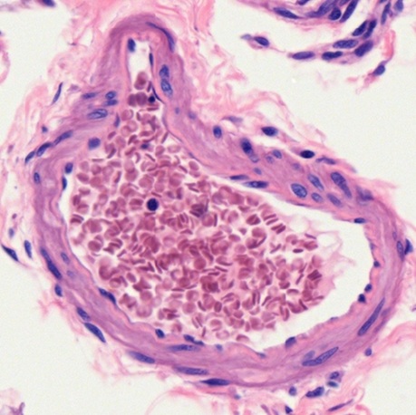 In sections of blood vessels, no matter of artery (Fig. 5-4), vein (Fig. 5-5), or capillary (Fig. 5-6), erythrocytes are found to be biconcave disc shape or dumbbell shape due to cutting. It reveals that the diameter (6-8 μm) of erythrocyte is almost the same as the thickness (7-10 μm) of a paraffin section used for light microscopic observation.