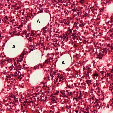 Two kinds of marrow tissues can be recognized by color. Red marrow is highly active due to the predominance of maturing erythrocytes. Yellow marrow is less active due to increasing amount of fat cells. However, the yellow marrow can be reactivated if the need arises for increased hematopoiesis. In a section of adult bone marrow stained by hematoxylin and eosin (Fig. 5-52), cellular elements can be observed. Many adventitial reticular cells or adipose cells (A) are found (Fig. 5-53). All developing stages of erythrocytes and leukocytes can also be found but are not easy to identify except the large multinucleated megakaryocytes (M). Sinusoid (S) are found to contain mature erythrocytes (Fig. 5-54). Blood vessel (V) can also be found in the marrow (Fig. 5-55).
