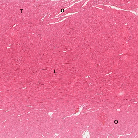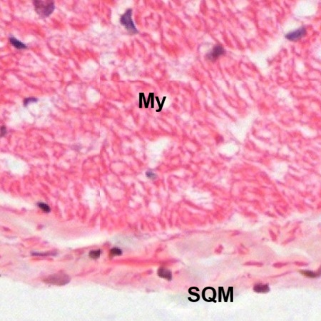 The thick myocardium also has the arrangement of complex, three-dimensional network. Muscle fibers are seen to be sectioned longitudinally (L), transversely (T), and obliquely (O) respectively (Fig. 8-9). Similar to that of atrial wall, the outermost epicardium of the ventricle (Fig. 8-10) is covered by a simple squamous mesothelium (SQM). Between mesothelium and myocardium (My) is fibroelastic connective tissue.