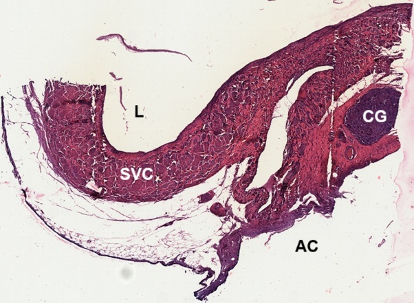 To know if the elastic fibers are present in the wall of vena cava, a section stained by VE is observed (Fig. 8-100). The section cut through partial atrium and shows atrial chamber (AC) and cardiac ganglion (CG) attached to the atrial wall. Lumen (L) of the superior vena cava (SVA) can be recognized. Tunica medium (TM) is thick, instead both tunica intima (TI) and tunica adventitia (TA) are thin (Fig. 8-101). In the tunica intima (Fig. 8-102), supporting connective tissue underneath the endothelium is mainly composed of fibrous collagenous tissue with few elastic fibers (EF).