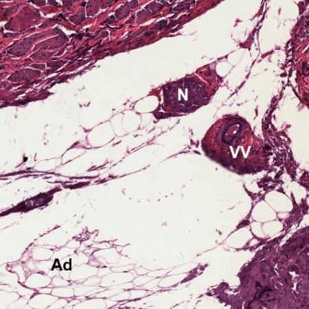 In tunica medium of the vena cava (Fig. 8-103), it is found that most smooth muscle fibers are cross sectioned and packed in bundles. As stated above (Figs. 8-96), most smooth muscle fibers in tunica medium are oriented circumferentially (CSM), the appearance of cross sections indicates that the vena cava is sectioned longitudinally along its length. Spaces among muscle bundle are filled with collagenous tissue (brick red) with few elastic fibers (black). In tunica adventitia (TA), while smooth muscle fibers in tunica medium are oriented circumferentially (CSM), here they are oriented longitudinally (LSM) with collagenous tissue and elastic fibers (Fig. 8-104). Vasa vasorum (VV), nerve bundles (N), and adipose tissue (Ad) can also be found (Fig. 8-105).