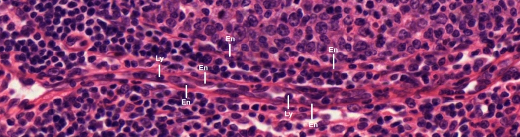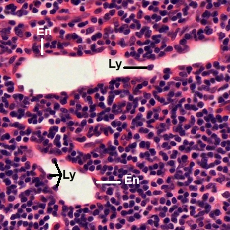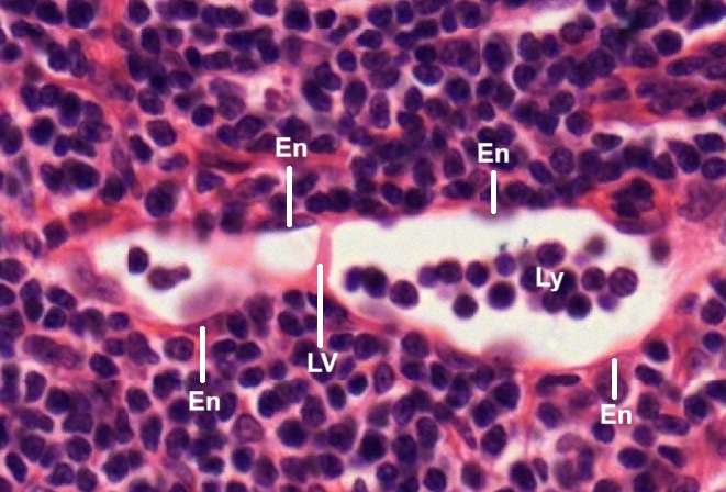 In a section of human lymph node stained by HE, two lymphatic vessels are found to run side by side (Fig. 8-106). Both of them have thin layer of endothelium (En). Many lymphocytes (Ly) can be seen in lumens of the lymphatic vessels.