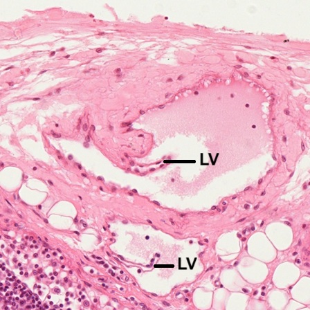 Lymphatic vessels are the components of the lymph vascular system and form a network of thin tubes that collect a watery fluid called lymph from body tissues and return it to the bloodstream. Since lymphatic vessels filter lymph through lymph nodes, it is convenient to use section of the lymph node for observing histological structure of the lymphatic vessel.