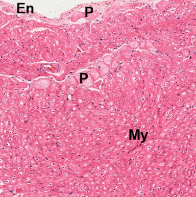 At certain sites underneath the endocardium (En), there are swollen cells with pale stained cytoplasm (Fig. 8-11). These cells are not found in the atrial wall. They are Purkinje fibers (P), a group of specialized cardiac muscle cells that form a network in the inner walls of the ventricles between endocardium (En) and myocardium (My). Some Purkinje fibers can be found in the myocardium near the endocardium (Fig. 8-12), at base of papillary muscle (PM) or even extend into the papillary muscle (Fig. 8-13). Purkinje fibers (P) can be distinguished from common cardiac muscle cells (C) by their pale cytoplasm. They have relatively few myofibrils arranged in an irregular manner immediately underneath the cell membrane (Fig. 8-14). Neither striations nor intercalated discs are formed in the Purkinje fibers. It has been proved that Purkinje fibers are involved with coordinated contraction of the entire ventricular myocardium to pump blood.