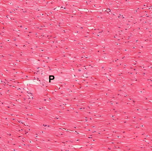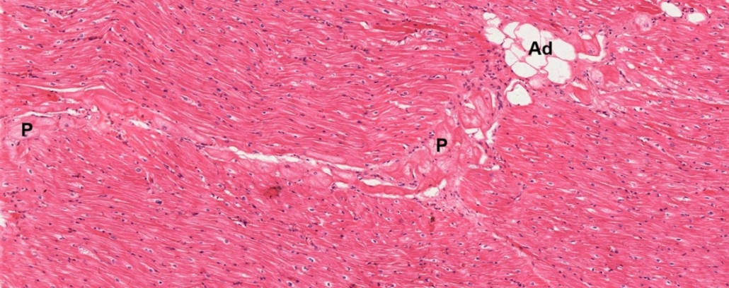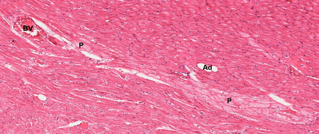 Purkinje fibers (P) are also found in between common cardiac muscle layers (Figs. 8-15, 8-16, 8-17, 8-18). Adipose tissue (Ad) is seen to be associated with the presence of Purkinje fibers (Figs. 8-15, 8-17, 8-18). Blood vessel (BV) can also be found (Fig. 8-17).