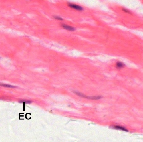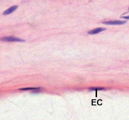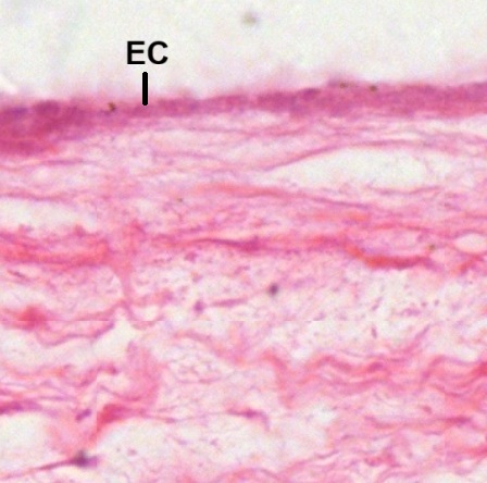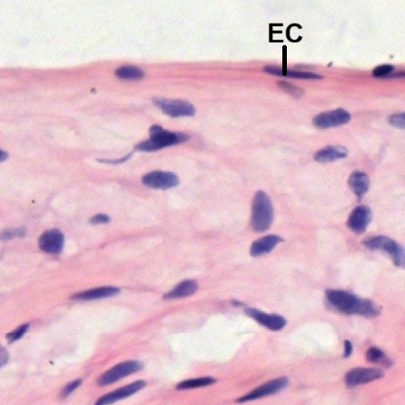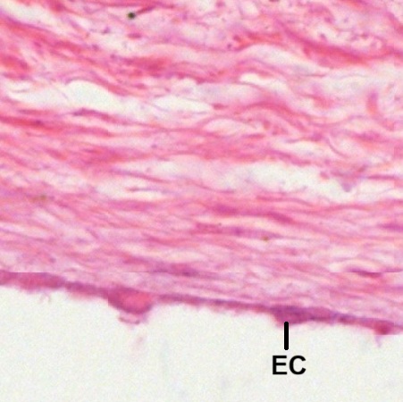 In a longitudinal section of the aortic valve (Fig. 8-22), either aortic side (Fig. 8-23) or ventricular side (Fig. 8-24) of the valve is covered by a layer of endothelial cells (EC). Underneath the layer of endothelial cells, fibrous connective tissue with fibroblasts can be seen.
