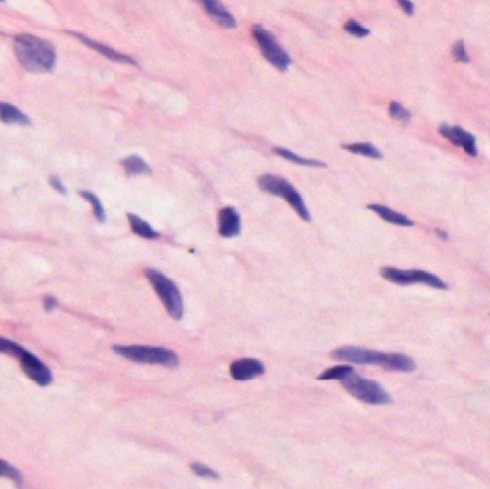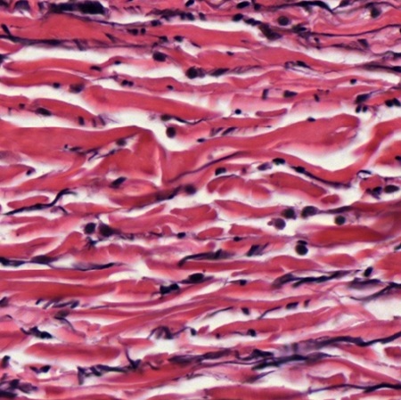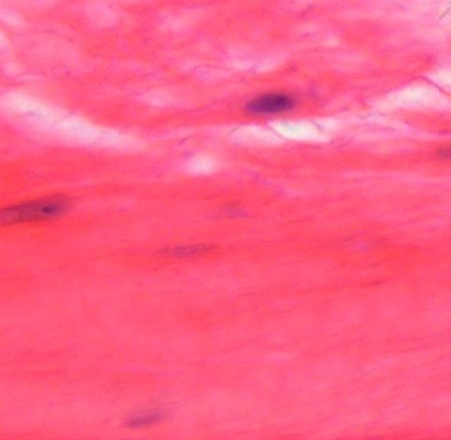 The core tissue of the mitral valve can be divided into three regions by the criteria of connective tissue (Fig. 8-30) : dense irregular connective tissue (A); loss connective tissue (B); dense regular connective tissue (C). Except the C-region (Fig. 8-33), both A-region (Fig. 8-31) and B-region (Fig. 8-32) contain cells other than fibroblasts. The composition of the C-region is very similar to that of ligament or tendon.