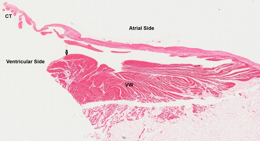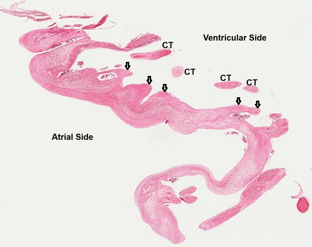 Tricuspid valve is located between right ventricle and right atrium. In a section of the valve (Fig. 8-38), ventricular side and atrial side can be judged by the presence of chordae tendineae (CT) and their attachments (arrow) on the valve leaflet. Both ventricular side (Fig. 8-39) and atrial side (Fig. 8-40) of the valve leaflet are covered by a layer of endothelial cells (EC). Underneath the layer of endothelial cells, fibrous connective tissue can be seen.