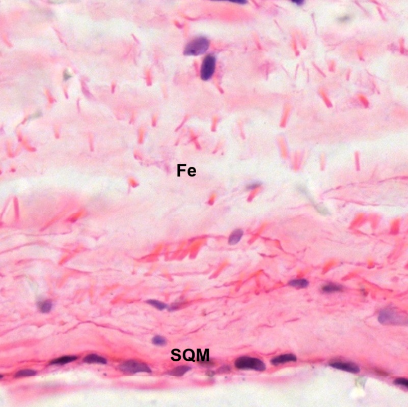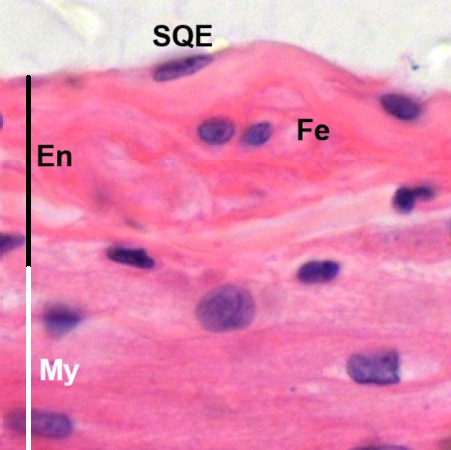 A section of cardiac wall is cut through the atrial wall and stained by HE (Fig. 8-1). It reveals three layered wall structure composed of epicardium (Ep), myocardium (My), and endocardium (En). There is a cardiac vessel (CV) seen within the layer of myocardium (Fig. 8-2). The innermost endothelium (En) is composed of a simple squamous endothelium (SQE) and subendothelial fibroelastic connective tissue (Fe). It is continuous with the adjacent myocardium (My).