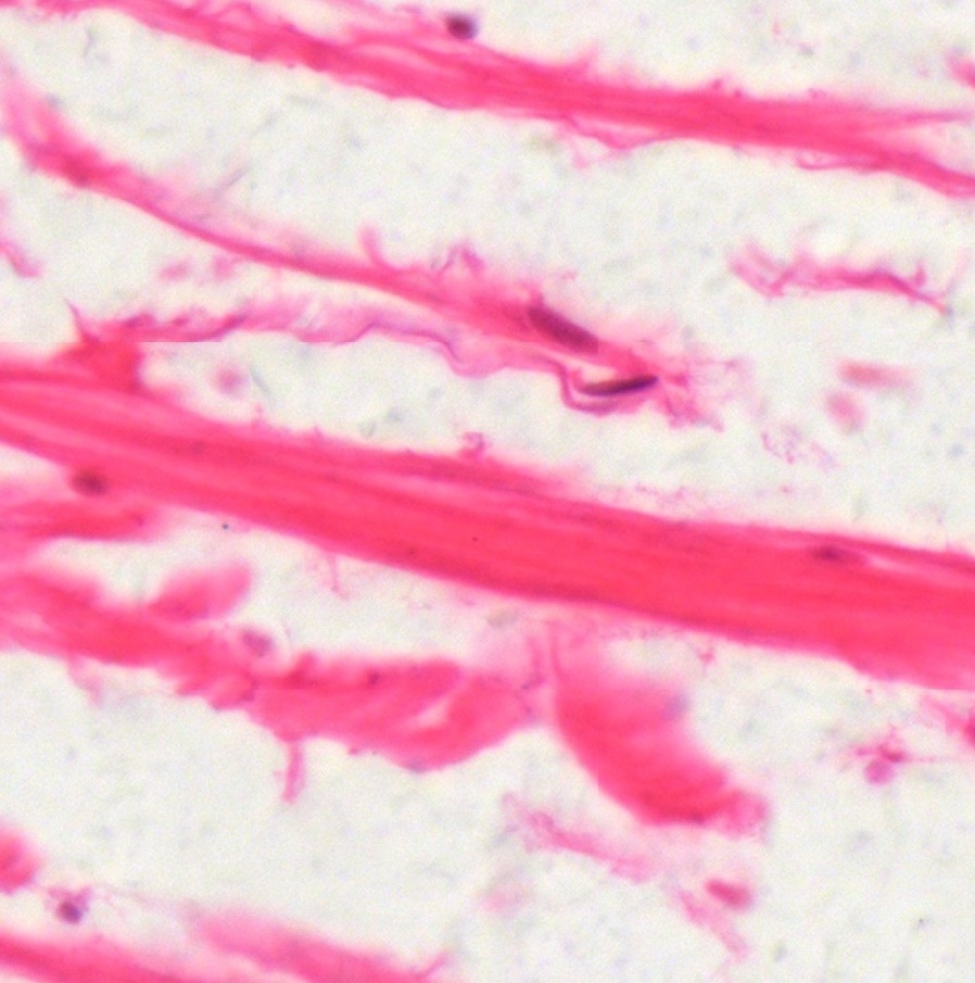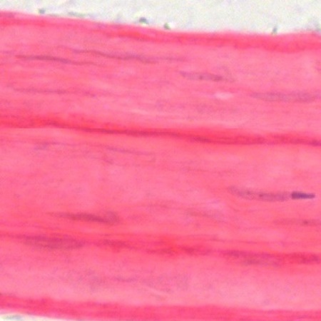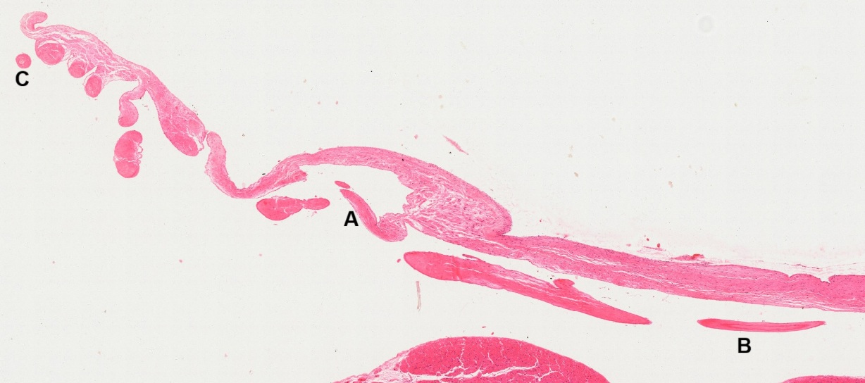 To observe histological composition of the chordae tendineae, micrographs are taken from three spots (Fig. 8-34): A. longitudinal section of an attached segment on the mitral valve (Fig. 8-35); B. longitudinal section of a terminal segment unattached on the valve (Fig. 8-36); C. transverse section of a free segment (Fig. 8-37).