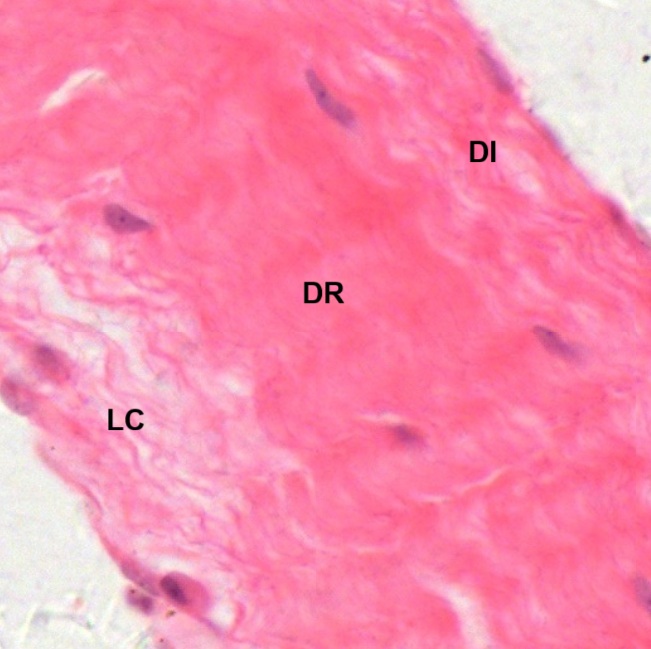 All three segments of chordae tendineae are encapsulated by a layer of endothelial cells. The attached segment (Fig. 8-35) is composed of dense regular connective tissue (DR) in the middle surrounded by loss connective tissue (LC) and dense irregular connective tissue (DI). The free segment (Fig. 8-36) is composed of dense regular connective tissue only, which is similar to composition of ligament. The unattached terminal segment (Fig. 8-37) shows a central core (C) surrounded by layers of circular fibrous connective tissue.