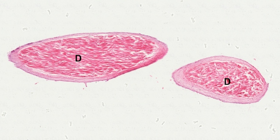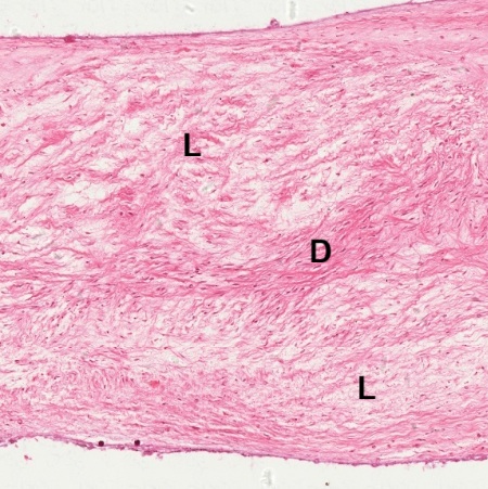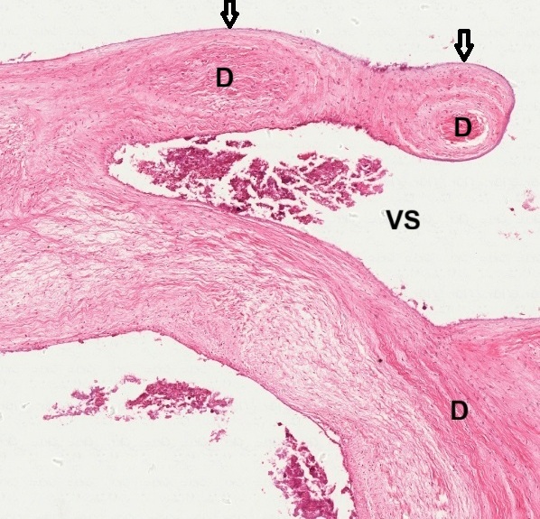 Each of the two attachments of chordae tendineae (arrow) show a mass of dense collagenous fibers (D) surrounded by loose connective tissue (Fig. 8-44). These two masses seem to originate from dense connective tissue (D) underneath the endothelial layer at ventricular side (VS). Sections of three adjacent chordae tendineae feature a layered structure consisting of a central core of dense collagen fibers (D), an outer layer of elastic fibers interwoven with loose collagen, and a single layer of endothelial cells covering the exterior (Figs. 8-45, 8-46)).