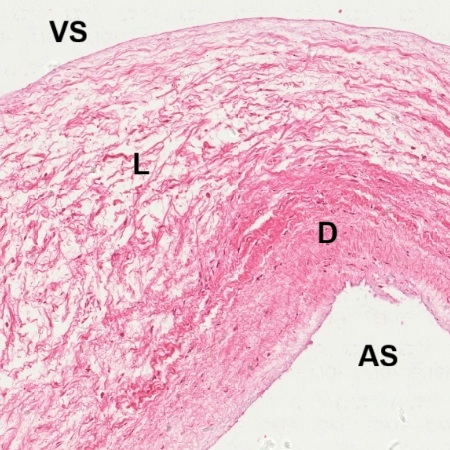 The core tissue of the tricuspid valve is composed of fibrous connective tissue which may have different arrangement of collagenous fibers and elastic fibers. In one part of the valve(Fig. 8-41), dense collagenous fibers (D) are seen in the middle surrounded by loose connective tissue (L). In other part of the valve (Fig. 8-42), loose connective tissue (L) is seen nearing the ventricular side (VS) while dense connective tissue (D) is seen nearing the atrial side (AS). At the sites for the attachment of chordae tendineae (arrow), dense collagenous fibers (D) is found to aggregate underneath the layer of endothelial cells (Fig. 8-43).