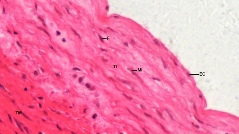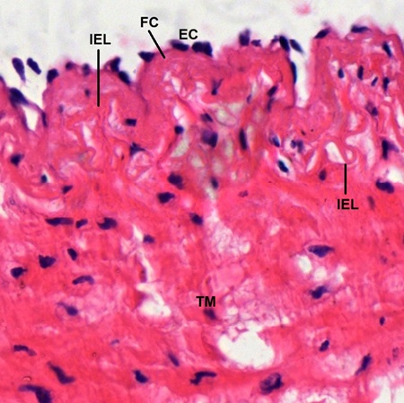 Elastic arteries are the largest ones which arise directly from the heart, including aorta, pulmonary arteries, brachiocephalic artery, common carotid arteries, subclavian arteries, and common iliac arteries. Here we use aorta as an example to illustrate their wall structures. In a transverse section of aorta stained by HE (Fig. 47), clear cut layers of tunica Intima (TI), tunica media (TM), tunica adventitia (TA), and junctional area between tunica media and tunica adventitia, known as external elastic lamina (EEL). Adipose tissue (Ad), nerve bundles (N), and vessel are found in the tunica adventitia. The vessel is called vasa vasorum (VV), which is a nourish vessel for the aorta. The tunica Intima (TI) is composed of a single layer of endothelial cells (EC) and a supporting layer of collagenous tissue in form of both fibers and discontinuous sheets (Fig. 8-48). It can be differentiated from the tunica media (TM) by staining. Fibroblasts (F) and myointimal cells (Mi) can be found in this layer of collagenous tissue. Myointimal cells are smooth muscle cells located in the tunica Intima of blood vessels, between the endothelial lining and the internal elastic lamina. They can proliferate to form a thickened layer of tissue called myointimal hyperplasia, which can lead to vessel stenosis.