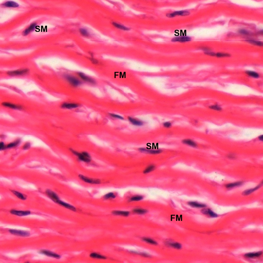 The tunica media is particularly broad and extremely elastic. It consists of few smooth muscle cells (SM) attached to concentric fenestrated membranes (FM) formed by elastic fibers, which can not be distinguished from collagen fibers by HE staining (Fig. 8-49). As shown in Fig. 8-47, between tunica media and tunica adventitia there is a thick layer, known as external elastic lamina (EEL). It is composed of elastic connective tissue (Fig. 8-50), similar to that of the ligament (Figs. 3-25, 3-26 in the chapter of Connective Tissue). The tunica adventitia consists of collagenous connective tissue with some elastic fibers (Fig. 8-51).