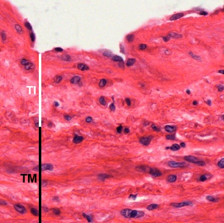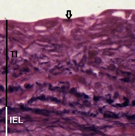Note: Intimal hyperplasia is the thickening of the inner layer of a blood vessel wall, caused by the migration and proliferation of smooth muscle cells in response to injury.