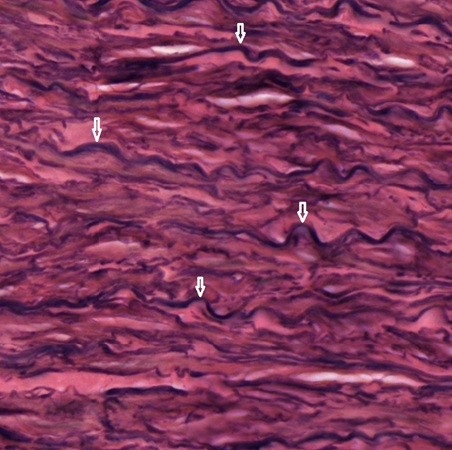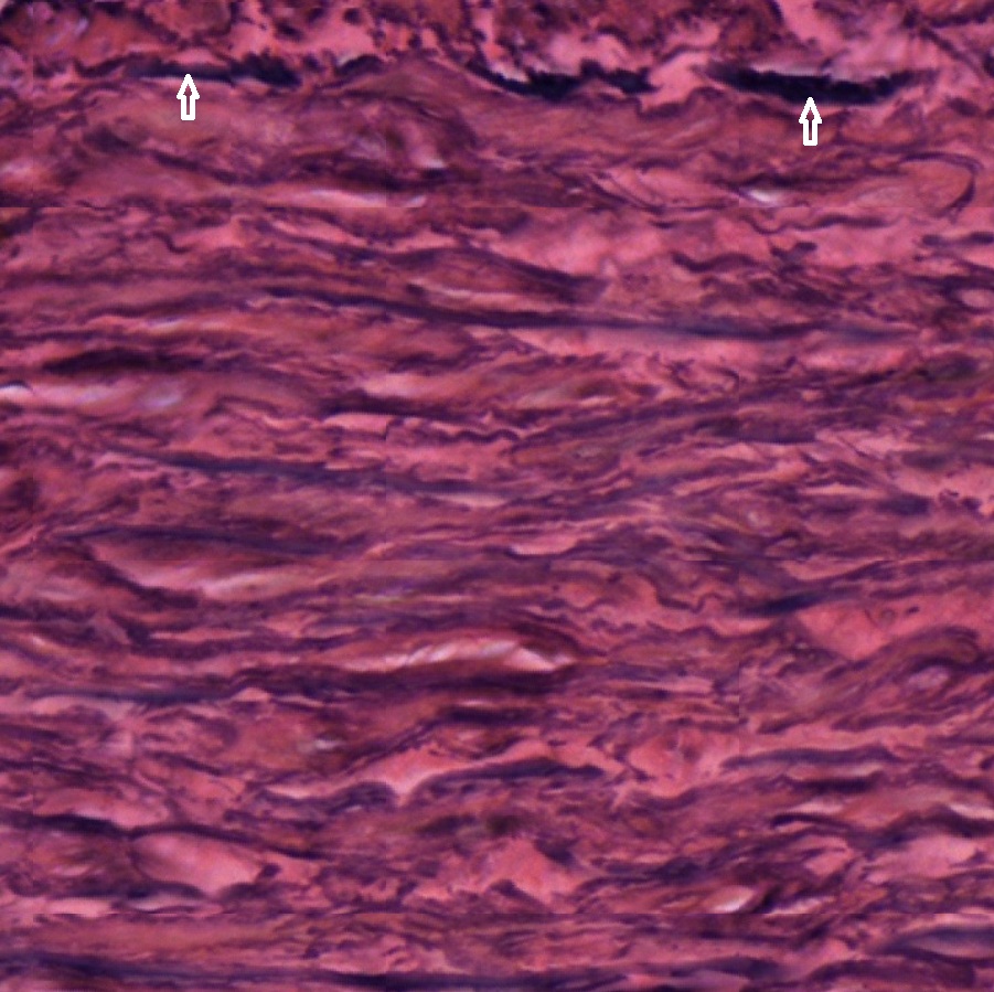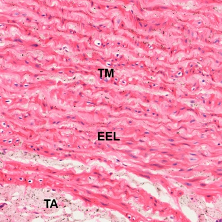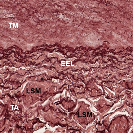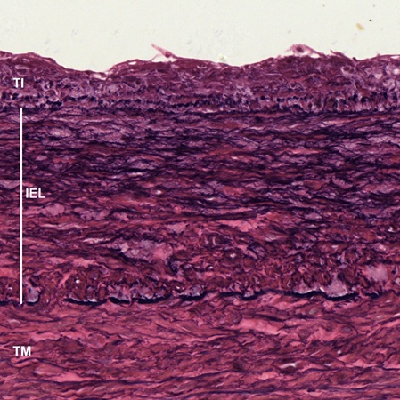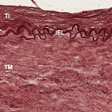 As shown in Fig. 8-54, the internal elastic lamina (IEL) is a junctional layer between tunica Intima (TI) and tunica media (TM). It can be divided into upper and lower two parts in terms of amount of elastic fibers and collagenous fibers (Fig. 8-55). The upper part has more elastic fibers (stained black). In contrast, the lower part has fewer elastic fibers but more collagenous fibers (stained brick red). The tunica media can also be divided into two parts. The upper part starts form the outer limit (arrow) of the internal elastic lamina (Fig. 8-56). It contains elastic fibers (stained black) elastic fibers (stained black), collagenous fibers (stained brick red), and smooth muscle cells which are mixed up with collagenous fibers. Most of elastic fibers are straight. The lower part also contains elastic fibers (stained black), collagenous fibers (stained brick red), and smooth muscle cells (Fig. 8-57). Most elastic fibers are curves (arrow). Fenestrations can be seen in both parts. The lower part seems to be the external elastic lamina (EEL) seen in Fig. 8-50.