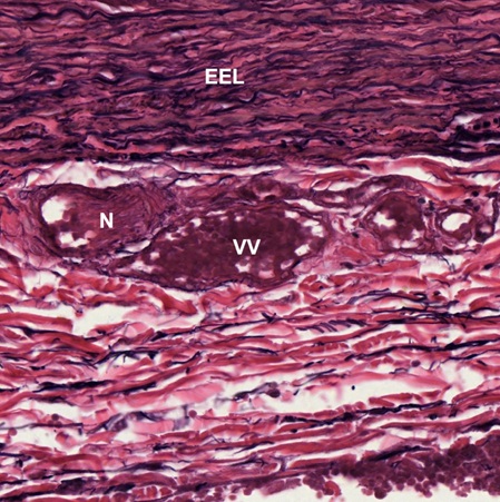 The tunica adventitia is composed of collagenous connective tissue stained red and elastic fibers stained black (Fig. 8-58). In comparison with the external elastic lamina (EEL), elastic fibers are relatively few (Fig. 8-59). Vasa vasorum (VV) and nerve bundles can be seen in the tunica adventitia.