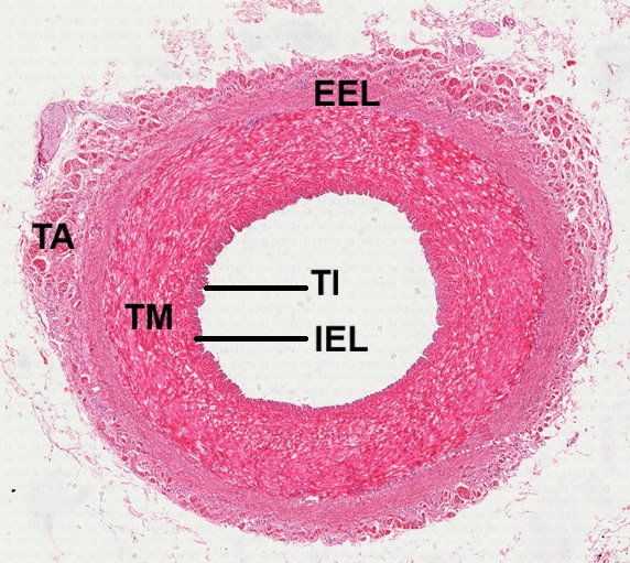 Muscular arteries are branches of elastic arteries or branches of muscular arteries. They are named arteries in addition to those elastic arteries stated above. In a transverse section of large artery (Fig. 8-63), it has typical features of a muscular artery, such as thin tunica Intima (TI), thicker tunica media (TM), and tunica adventitia (TA) containing vasa vasorum (VV). The tunica Intima is composed of endothelium (E) and a thin layer of subendothelial connective tissue where collagenous fibers and few longitudinally oriented smooth muscle fibers (Fig. 8-64). Internal elastic lamina is (IEL) visible and can be distinguished from the tunica media (TM) which contain many layers of circumferential smooth muscle fibers mingled with elastic, reticular, and collagenous fibers (Fig. 8-65). These fibers cannot be differentiated in HE stained section. External elastic lamina (EEL) is present between tunica media (TM) and tunica adventitia (TA) which is composed of collagenous and elastic tissue (Fig. 8-66). Some smooth muscle fibers may also be found in the tunica adventitia.