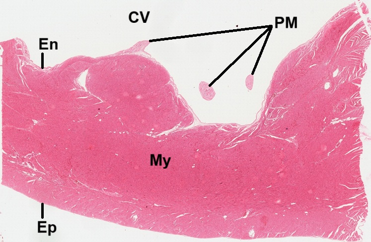 Histological structure of the ventricle has not much difference from that of the atrium except the thickness (Fig. 8-7). The ventricular wall is also composed of epicardium (Ep), myocardium (My), and endocardium (En). Inside the chamber cavity (CV), there are sections of three papillary muscles (PM). As seen in the section of atrium, the innermost endothelium (En) of ventricle is composed of a simple squamous endothelium (SQE) and subendothelial fibroelastic connective tissue (Fe), which is continuous with the adjacent myocardium (My).