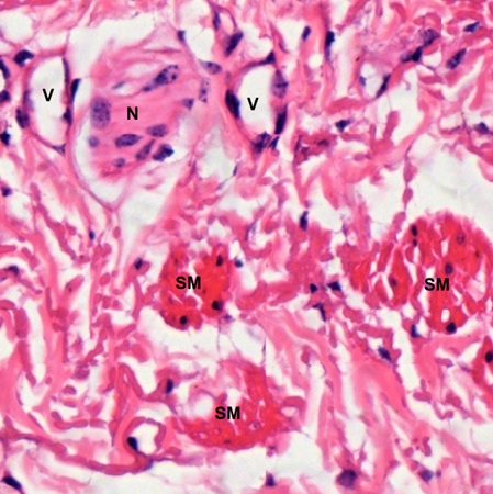 A transverse section of large vein stained by HE (Fig. 8-90), which is labeled as “Medium Vein” in DSMH, is observed. It is also composed of tunica Intima (TI), tunica media (TM), and tunica adventitia (TA) as seen in smaller veins, but has thicker subendothelial connective tissue layer (Fig. 8-91). Circular smooth muscle fibers appear to be interspersed among collagenous connective tissue In tunica media. The tunica adventitia is much thicker and contains many longitudinally oriented smooth muscle fiber bundles (LSM) among collagenous connective tissue with elastic fibers. Vasa vasorum (VV) are also seen.