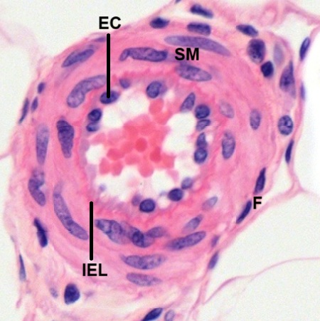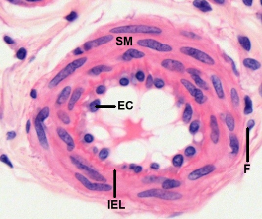 An arteriole is the smallest division of the arterial network, connecting arteries to capillary beds. Although all three layers such as tunica Intima, tunica media, and tunica adventitia are visible, the wall of an arteriole contains only 1-5 layers of smooth muscle fibers in the tunica media. By this criterion, many ambiguously defined “small arteries” are not necessarily arterioles. For example, in a section of adipose tissue stained by HE (Fig. 8-74), the original targets are small artery (A) and small vein (V) but neither of them is arteriole. Many smaller ones could be. Using the labeled small artery as a center, two arterioles can be found at the direction between four and five o’clock (Figs. 8-75 and 8-76). Both of them consist of single layer of endothelial cells (EC) with relatively few supporting tissue in tunica Intima and at least three layers of smooth muscle fibers (SM) in tunica media. Outside the smooth muscle fibers there is a thin layer of tunica adventitia with visible fibroblasts (F). A layer of zig-zag red line is seen between tunica intima and tunica medium. It is internal elastic lamina (IEL).