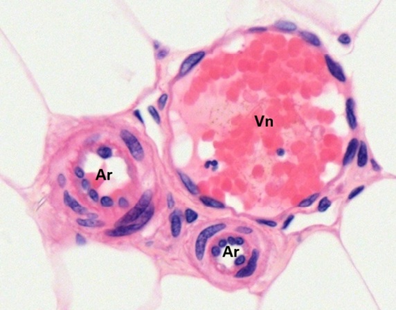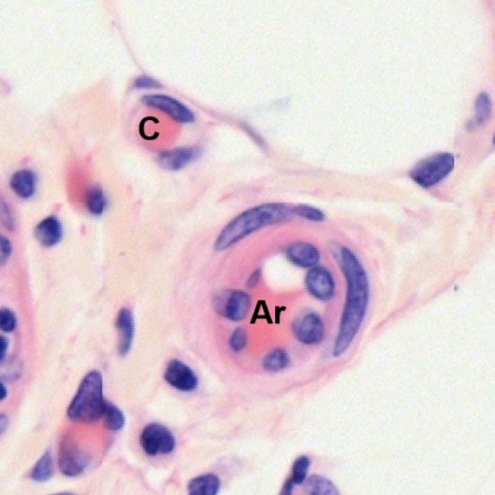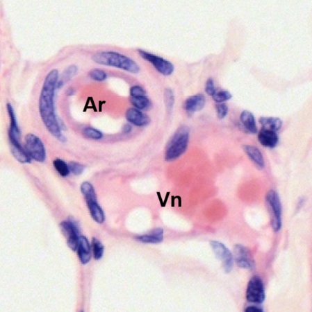 There are many arterioles that can be found in the same tissue section. In Fig.8-77, an arteriole (Ar) having two layers of smooth muscle fibers is found with a venule (Vn) is seen. In Fig. 8-78, an arteriole (Ar) having only layer of smooth muscle fiber with a capillary (C) is seen. In Fig. 8-79, two arterioles (Ar) are seen with a venule (Vn). The internal elastic lamina (IEL) can be seen as zig-zag red lines seen between tunica intima and tunica medium of both arterioles. Histology structures of venule and capillary are described later in this chapter.