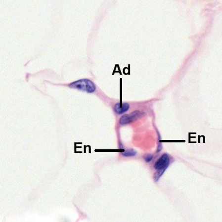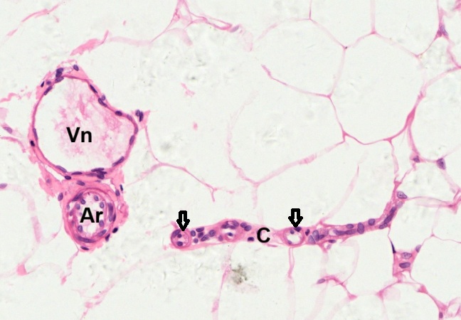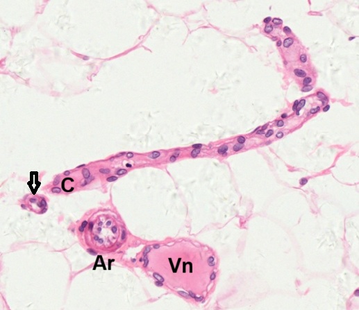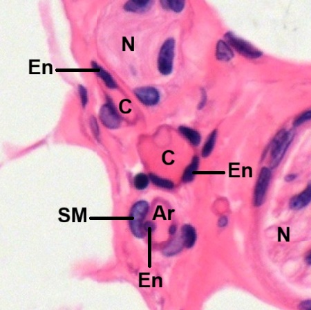 As terminal ends of arterial blood supply, many capillaries are distributed to form capillary network within tissues and organs. In a section of adipose tissue (Fig. 8-80), not only small arteries (A), small veins (V), and nerve bundles (N) are seen, but also capillaries can be found. A capillary is found in the stroma of the adipose tissue (Fig. 8-81). Transverse section of the capillary reveals the wall composition of a single endothelial layer (En). Nucleus of an adipocyte (Ad) is next to it. Longitudinal section of a capillary (Fig. 8-82) also clearly shows the wall structure of a single endothelial layer. In one larger stomal area (Fig. 8-83), two capillaries (C), one arteriole (Ar), and two nerve bundles (N) are found. To distinguish capillary from arteriole is mainly based on the existence of smooth muscle fibers (SM) outside the endothelial layer (En) of the arteriole.