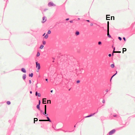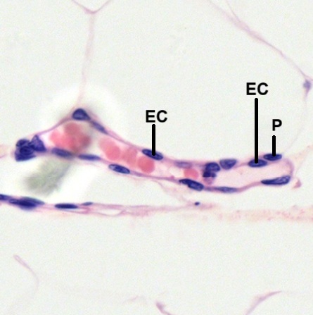 In blood circulation, oxygen carrying arteries form capillary network at the end. After gas exchange within tissue, the capillary network connects with carbon dioxide carrying veins to start blood drainage into venous system. In both tissue sections above (Figs. 8-74 and 8-80), anatomical connection from arteriole (Ar) to capillary (C), then to venule (Vn), which is the smallest vein, can be observed from two figures below (Figs. 8-84 and 8-85). Note that there are three locations (arrow) showing transverse section of capillary mixed within longitudinal sections (C) of capillaries. It indicates the formation of capillary network. Either venule (V) has much larger lumen and thinner wall than the arteriole (Ar) next to it. Both venules are also known as post-capillary venules. The tunica intima of a post-capillary venules consists of endothelium (En) on a very thin subendothelial connective tissue layer (Fig. 8-86). Pericytes (P) can be seen to be with endothelial cells. The tunica medium of this small venule is very thin or absent, while the tunica adventitia is thick and consists of collagenous connective tissue.