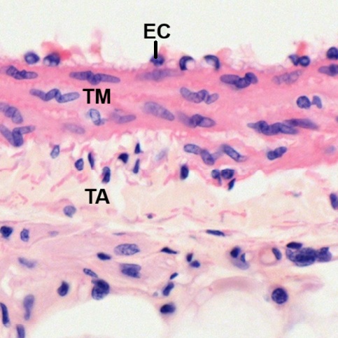 In a transverse section of medium artery, it shows typical feature of a typical muscular artery even though its lumen diameter is only about 2 mm (Fig. 8-67). Arterial wall is also composed of tunica Intima (TI), tunica media (TM), and tunica adventitia (TA). Both internal elastic lamina (IEL) and external elastic lamina (EEL) are visible. The tunica Intima is covered by a single layer of endothelial cells (EC), which project into the lumen (Fig. 8-68). Underneath the endothelial layer, there is a relatively thin layer of fibrous connective tissue (FC). The internal elastic lamina (IEL) is also thin and contains only 2-3 curved elastic fiber bundles. Although the tunica media (TM) is also composed of fenestrated elastic membranes and smooth muscle fibers (SM), the amount of smooth muscle fibers is much more than that of elastic artery (Figs. 8-69, 8-70).