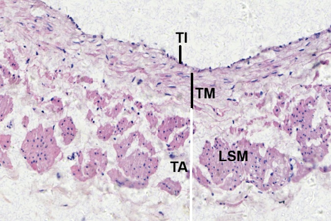 The vena cava, including superior vena cava and inferior vena cava, is the largest vein in human body. Transverse section of a vena cava (Fig. 8-94) shows that there are many eminences (four-pointed stars) from tunica intima (TI). Apparently, this is a vena cava with intimal hyperplasia. Compared with the above two large veins, it has a thicker tunica media (TM) and thinner tunica adventitia (TA). Vasa vasorum (VV) are seen in tunica adventitia. To avoid observing possible abnormality, it is focused on a spot without eminence (blue circled) at high magnification (Fig. 8-95). It shows that the tunica intima (TI) is composed of a single layer of endothelium with a thin layer of fibrous connective tissue. No layer of elastic tissue is found between tunic intima and tunica medium (TM). The tunica medium consists of smooth muscle fibers and wavy sheets of elastic fibers, which are not stained clearly by HE (Fig. 8-96). Most smooth muscle fibers are oriented circumferentially (CSM), but some are longitudinally oriented (LSM).