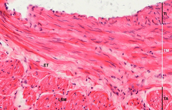 For comparison, a transverse section of the other large vein stained by HE (Fig. 8-92), which is labeled as “Large Vein” in DSMH, is also observed. Vasa vasorum (VV) are seen in tunica adventitia. This vein has thin tunica Intima (TI) as seen in the above vein, but thicker tunica media (TM) and tunica adventitia (TA) than those of the above vein due to increase of smooth muscle fibers in both tunica media and tunica adventitia (Fig. 8-93). The smooth muscle fibers are circularly oriented in tunica media (TM) but longitudinally oriented in bundles (LSM) in tunica adventitia (TA). Elastic fibers can be found to be dispersed among smooth muscle fibers in tunica media (TM). More elastic fibers and even a band of elastic tissue (ET) are seen between tunica media (TM) and tunica adventitia (TA).