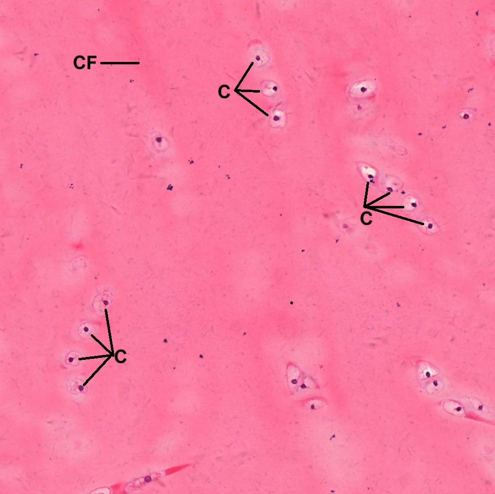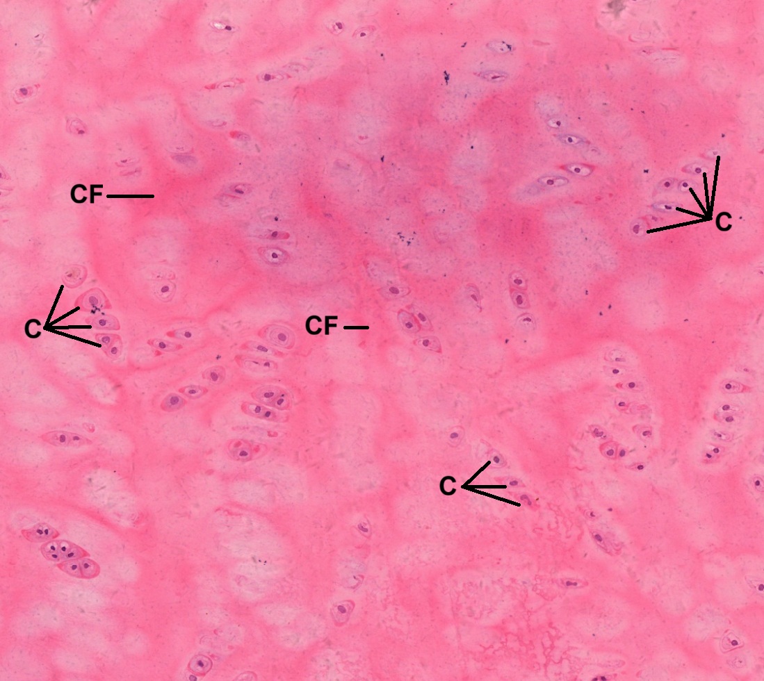 It can be found in many locations of the human body, including pubic symphysis, intervertebral discs, glenoid labrum of shoulder joint, acetabular labrum of hip joint, etc. It consists of a mixture of white fibrous tissue and cartilaginous tissue in various proportions (Fig. 4-10). The chondrocytes (C) with deep-stained nuclei are aligned in parallel rows, housed singly in individual lacunae. Bundles of collagen fibers (CF) are found to be arranged in a more or less regular fashion between the rows of chondrocytes (Figs. 4-11 and 4-12).