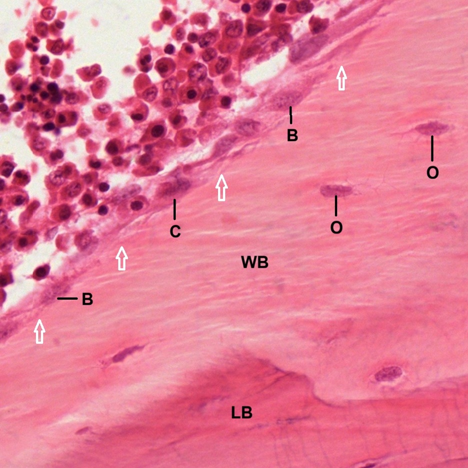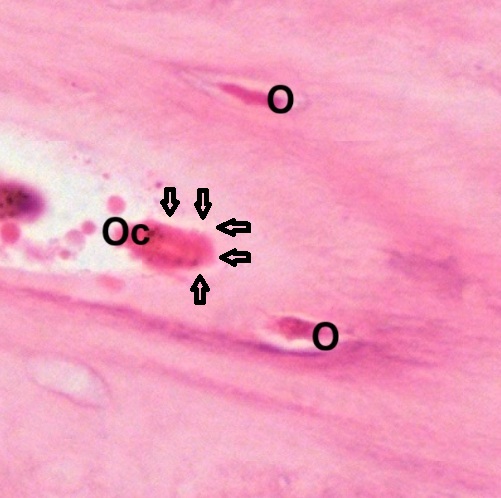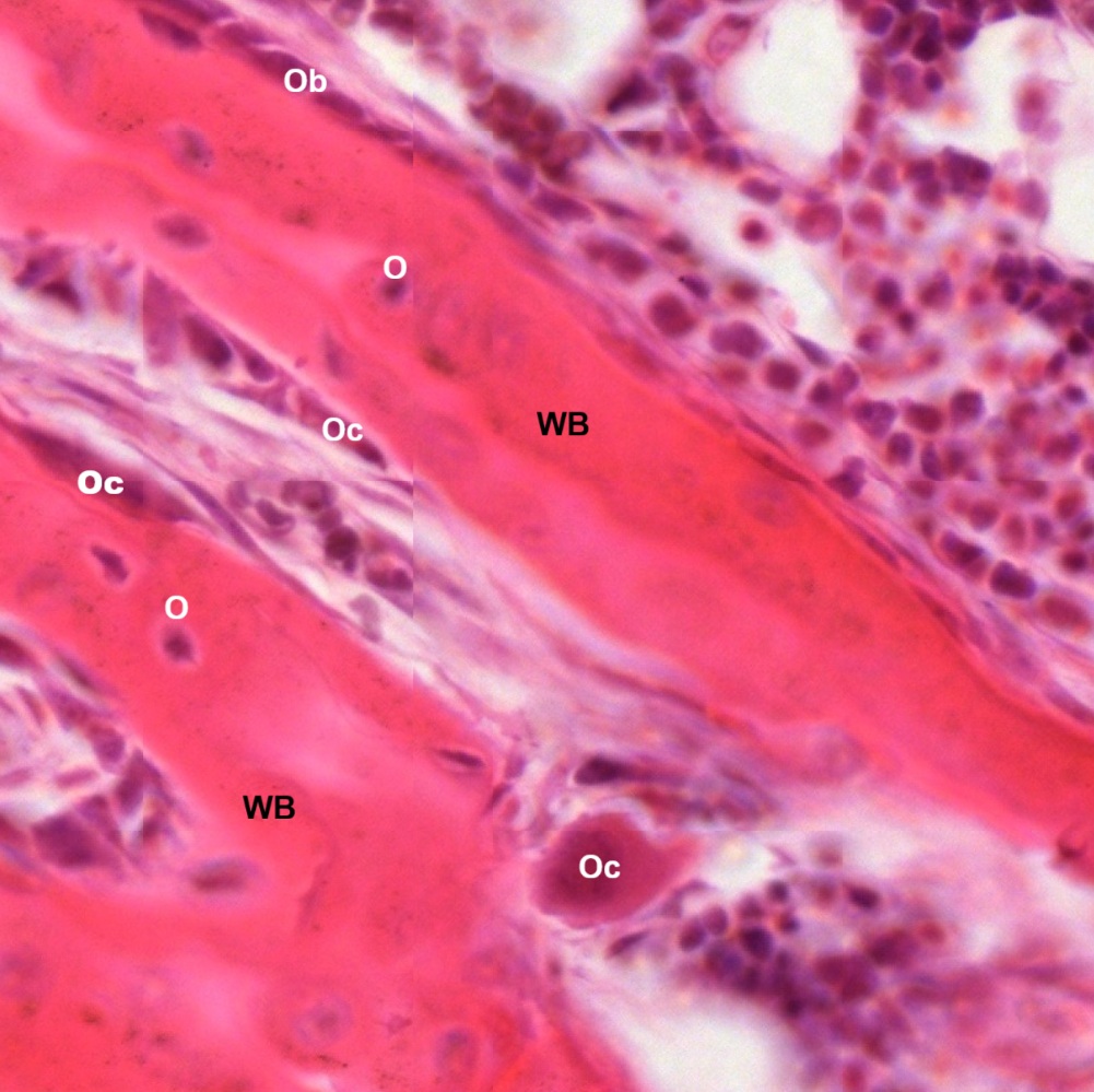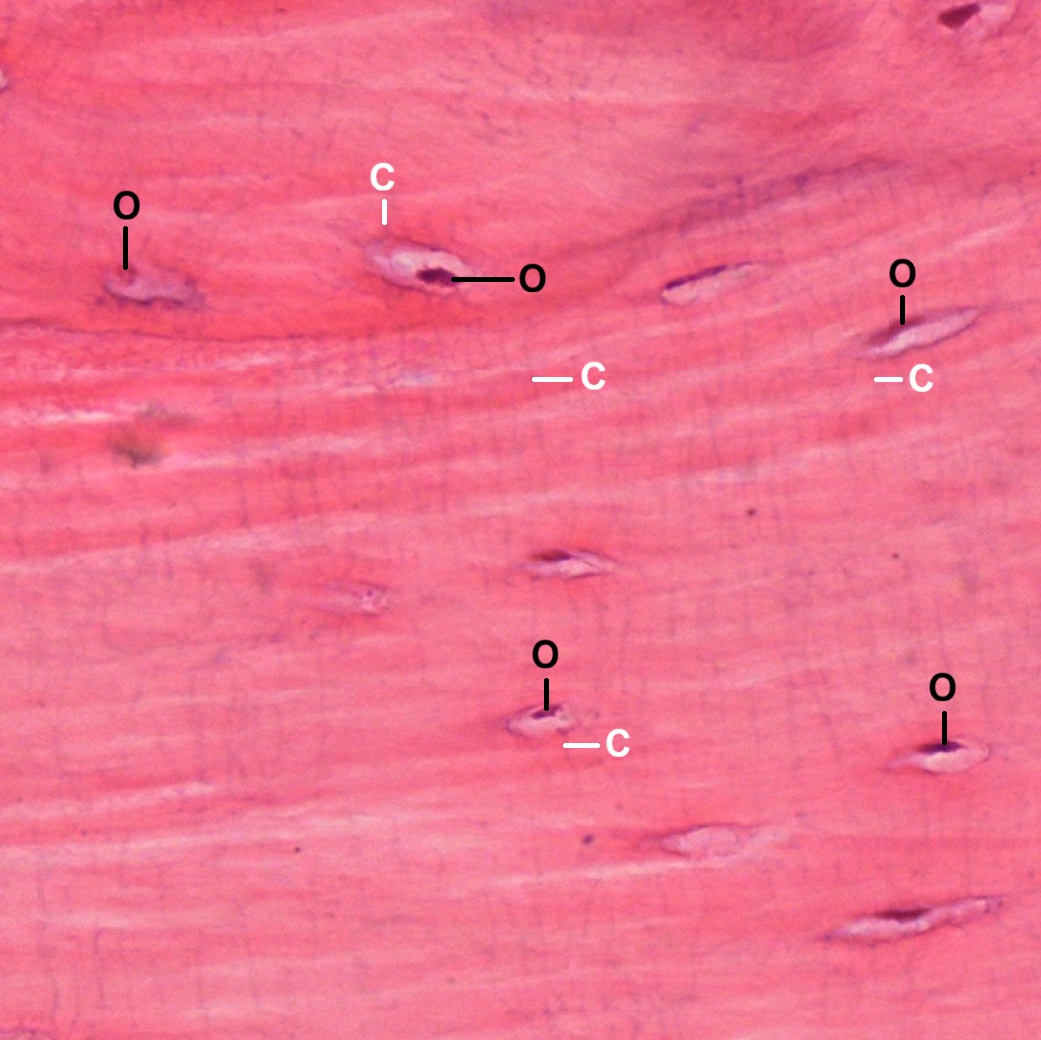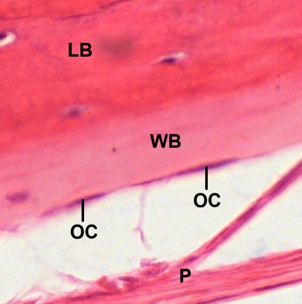 In a paraffin section of compact bone after decalcification and staining with hematoxylin and eosin (Fig. Fig. 4-21), the organization of concentric lamellae is not as clear as being observed in ground section but the formation of Haversian system using Haversian canal (HC) as a center still can be recognized. Osteocytes or Osteoblasts (O) can be observed to be located in lacunae (Fig. 4-22). They have densely stained, irregular nuclei and pale, basophilic cytoplasm. Their cytoplasmic processes (C) can be barely seen inside the canaliculi. On the outer surface of compact bone (Fig. 4-23), there is a layer of condensed fibrous tissue covering the bone, known as periosteum (P), containing numerous osteoprogenitor cells (OC) which look like fibroblasts. Between periosteum and mature lamellar bone (LB), there is a layer of immature bone, known as woven bone (WB), which is pale stained and contains no bone lamellae. The separation of periosteum from woven bone is caused during tissue preparation.