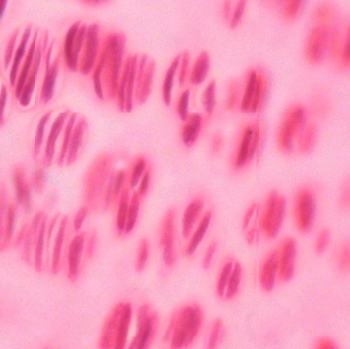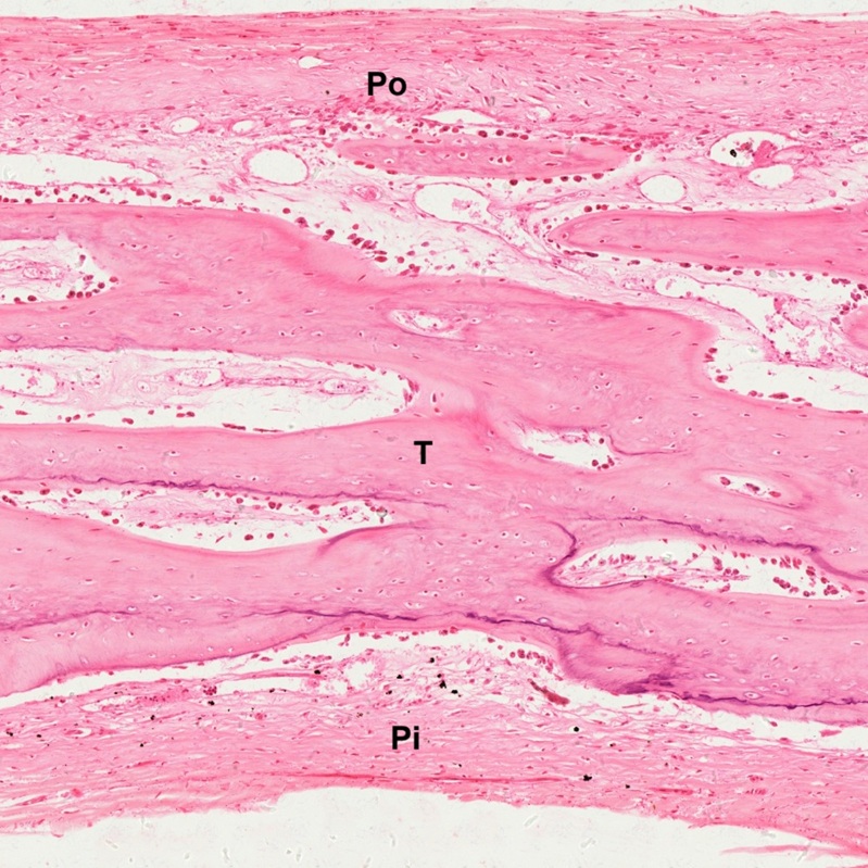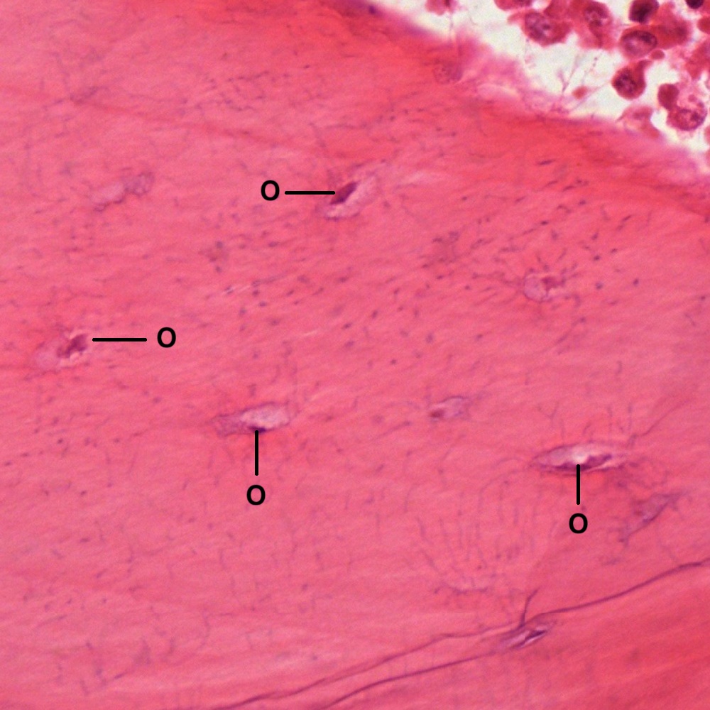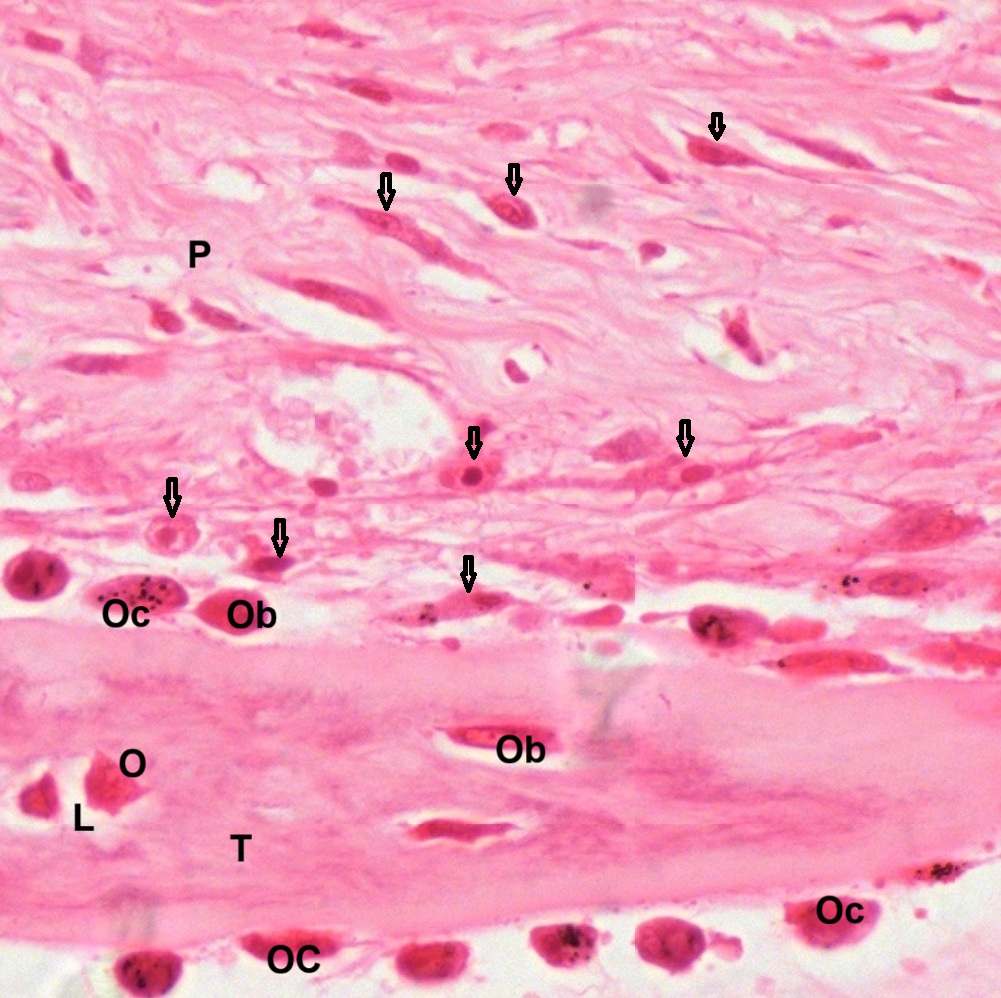 In a paraffin section of compact bone after decalcification and staining with hematoxylin and eosin (Fig. Fig. 4-21), the organization of concentric lamellae is not as clear as being observed in ground section but the formation of Haversian system using Haversian canal (HC) as a center still can be recognized. Osteocytes or Osteoblasts (O) can be observed to be located in lacunae (Fig. 4-22). They have densely stained, irregular nuclei and pale, basophilic cytoplasm. Their cytoplasmic processes (C) can be barely seen inside the canaliculi. On the outer surface of compact bone (Fig. 4-23), there is a layer of condensed fibrous tissue covering the bone, known as periosteum (P), containing numerous osteoprogenitor cells (OC) which look like fibroblasts. Between periosteum and mature lamellar bone (LB), there is a layer of immature bone, known as woven bone (WB), which is pale stained and contains no bone lamellae. The separation of periosteum from woven bone is caused during tissue preparation.