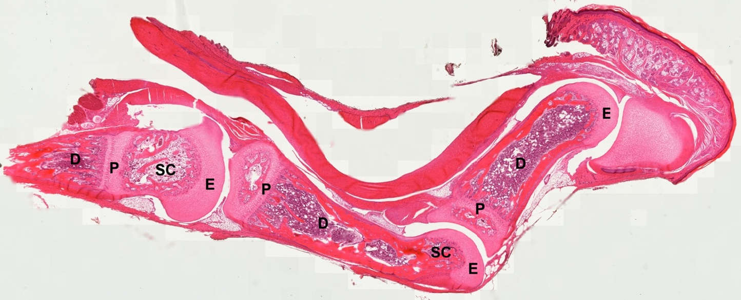 A longitudinal section of fetal finger stained by hematoxylin and eosin (Fig. 4-27) is a good example to illustrate both primary ossifications occurring in diaphysis (D), or called shaft of a long bone, and secondary ossification occurring in epiphysis (E). The cartilaginous epiphysis is separated from the diaphysis by the epiphyseal growth plate (P), which provides for growth in length of long bone. A secondary ossification center (SC) in epiphyses where bone formation begins after birth, contributes to the growth and development of the skeleton. These centers eventually fuse with the primary ossification center in the bone shaft to form the mature adult bone.