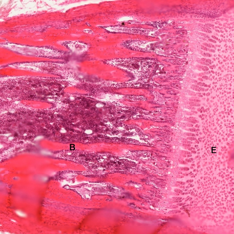 Detailed process of endochondral ossification can be revealed by a transition (Fig. 4-28) between epiphyseal cartilage (E) and new bone (B) in the following six sequential zones (Fig. 4-29):