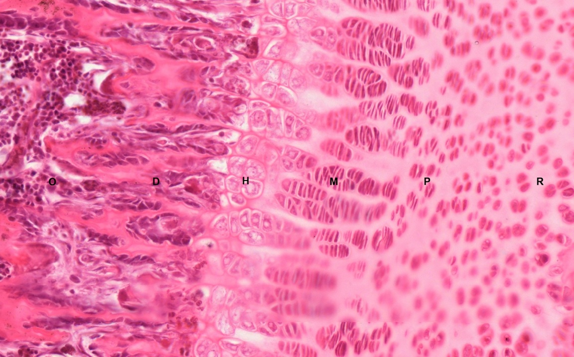 5) Zone of cartilage degeneration (D) shows degenerated chondrocytes and invasion of osteogenic cells and capillaries from the marrow cavity of the diaphysis (Fig. 4-34).