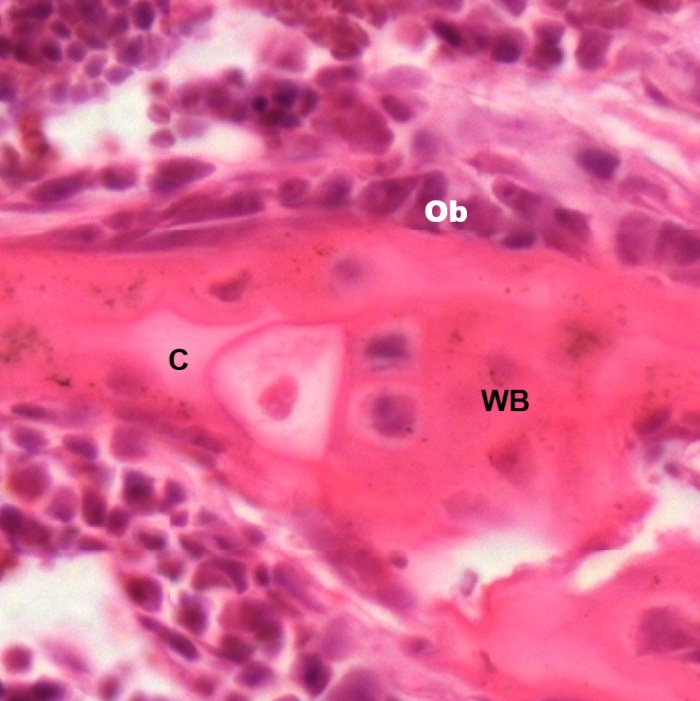 In metaphysis (Fig. 4-36), the newly formed woven bone (WB) embraces a core of light stained spicules of calcified cartilage matrix (C). Numerous osteoblasts (Ob) can be seen on the surface. Except the osteoblasts (Ob), some osteoclasts (Oc) are also found (Fig. 4-37). They play an important role in bone reabsorption during bone maturation and bone remodeling. Osteocytes (C) in lacunae can be also seen in the woven bone (WB).