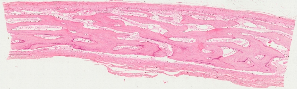 H030130 Developing Membrane Bone, showing intramembranous bone formation of infant, sec., human, HE. (Figs. 4-38, 4-39, 4-40, 4-41) - Staining methods and results: