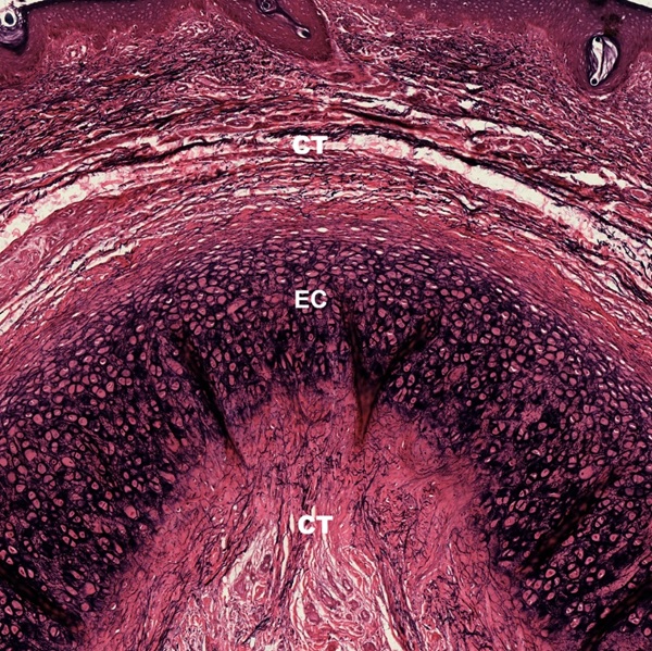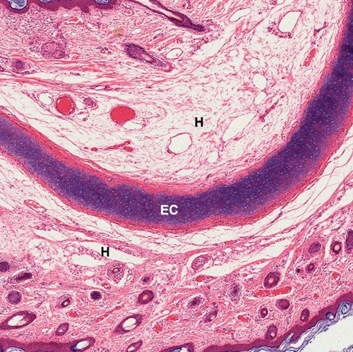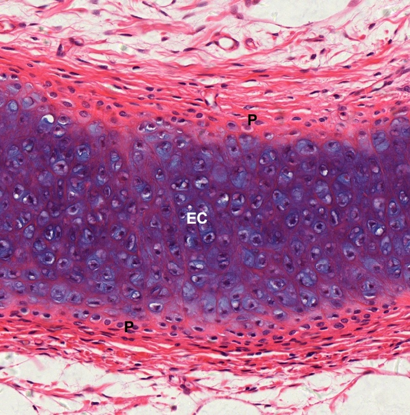 Elastic cartilage is a type of cartilage present in the auricle of the ear giving it shape, providing shape for the lateral region of the external auditory meatus, medial part of the auditory canal, Eustachian tube, corniculate and cuneiform laryngeal cartilages, and epiglottis. In a section of auricle (Fig.4-5) stained by hematoxylin-eosin, elastic cartilage (EC) is found to be embedded in the connective tissue underneath the submucosa of the skin, known as hypodermis (H). In a continuation with the hypodermis, red-stained perichondrium (P) envelops the purple-stained elastic cartilage (Fig. 4-6). Inside the elastic cartilage (Fig. 4-7), chondrocytes (C) are housed in lacunae (L). Occasional lacunae display two chondrocytes (arrow).